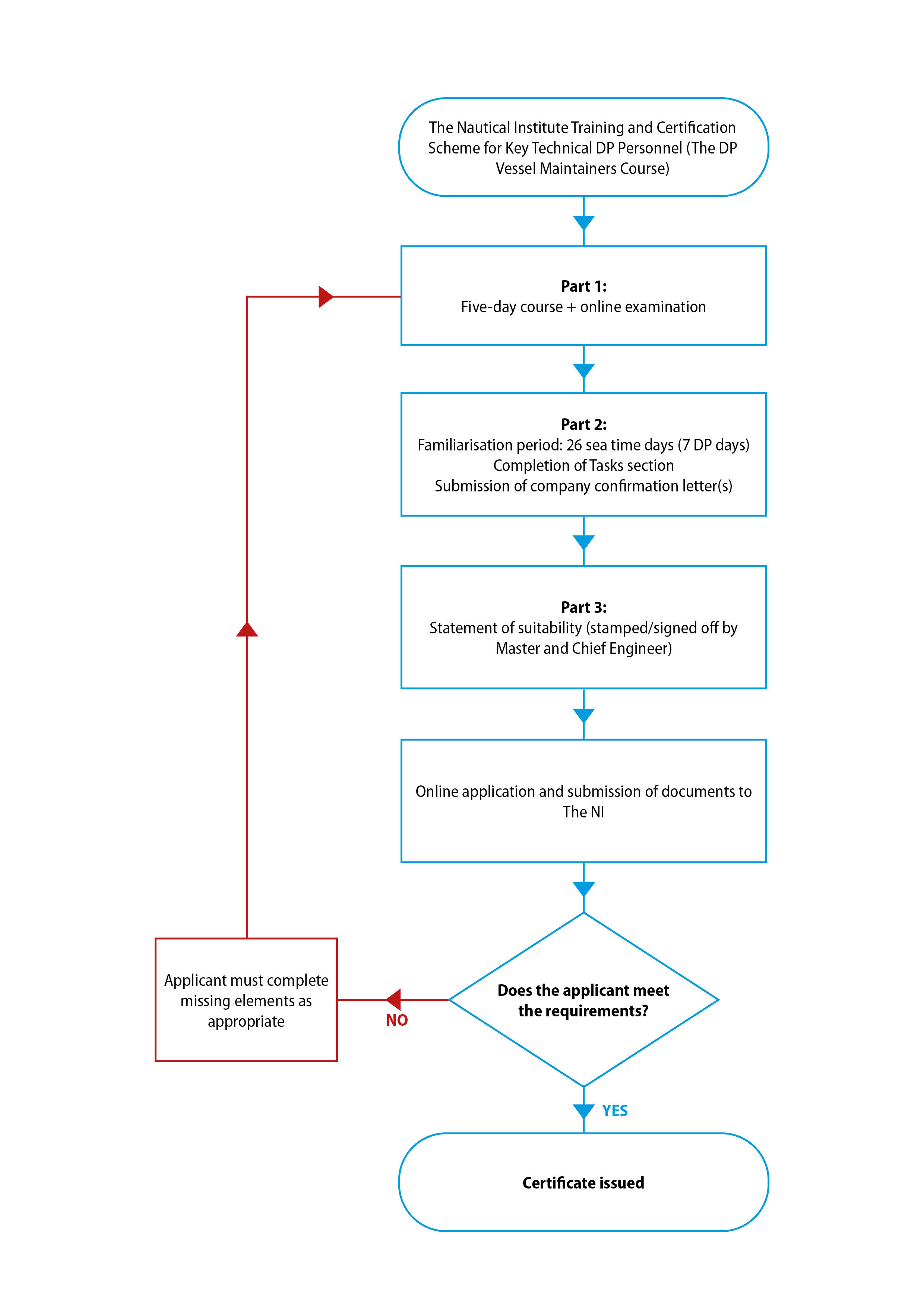 Note: In order to avoid deterioration of skills during the training period, all elements of the DPVM Training Scheme shall be completed within two years. When applying and submitting documents to The Nautical Institute, all components of the programme (shore-based courses, DP sea time, task sections, Statement of Suitability form and other elements) must have been completed within the previous two years. In the event that any training phases fall outside of the two-year validity period, the trainee will be required to repeat the expired training phase.
